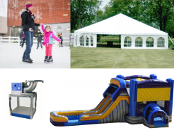 WinterFest Village Experience — transform your property into a cozy, family‑friendly winter village that’s ready to host school events, church gatherings, HOA parties, and large community celebrations. This all‑inclusive rental brings together the highlights people expect at a seasonal festival: a fully staffed ice skating rink run by experienced attendants, a heated 20x20 tent to shelter guests from the cold, and a curated entertainment selection where you choose one combo inflatable, one obstacle course or sports game, and one concession station (popcorn, sno‑cones, or cotton candy). Seating and ambiance are included: four 8‑foot tables with 40 black chairs and 100 feet of bistro‑style string lighting with music create a warm, inviting gathering area. For winter packages, any required generators are available at a 50% discount; a propane tank for the tent heater is available for $30 or you may supply your own. Delivery costs, fees, and taxes are not included. Ideal for organizers who want a turnkey, festive experience that keeps guests comfortable and entertained from first skate to last sweet treat.